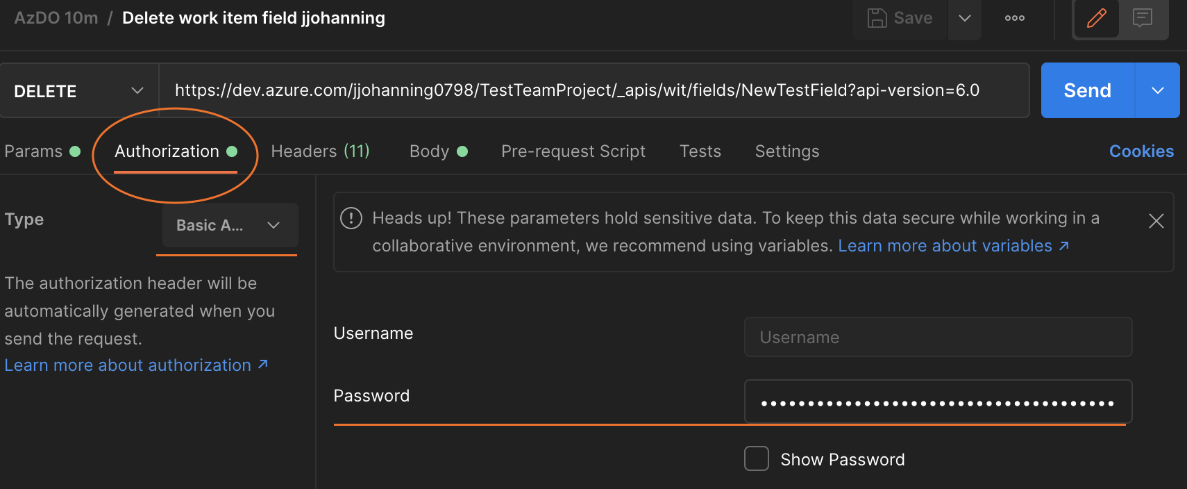 Under the Postman authentication’s tab, we can leave the username blank and enter the PAT for the password. Use Basic Authentication.