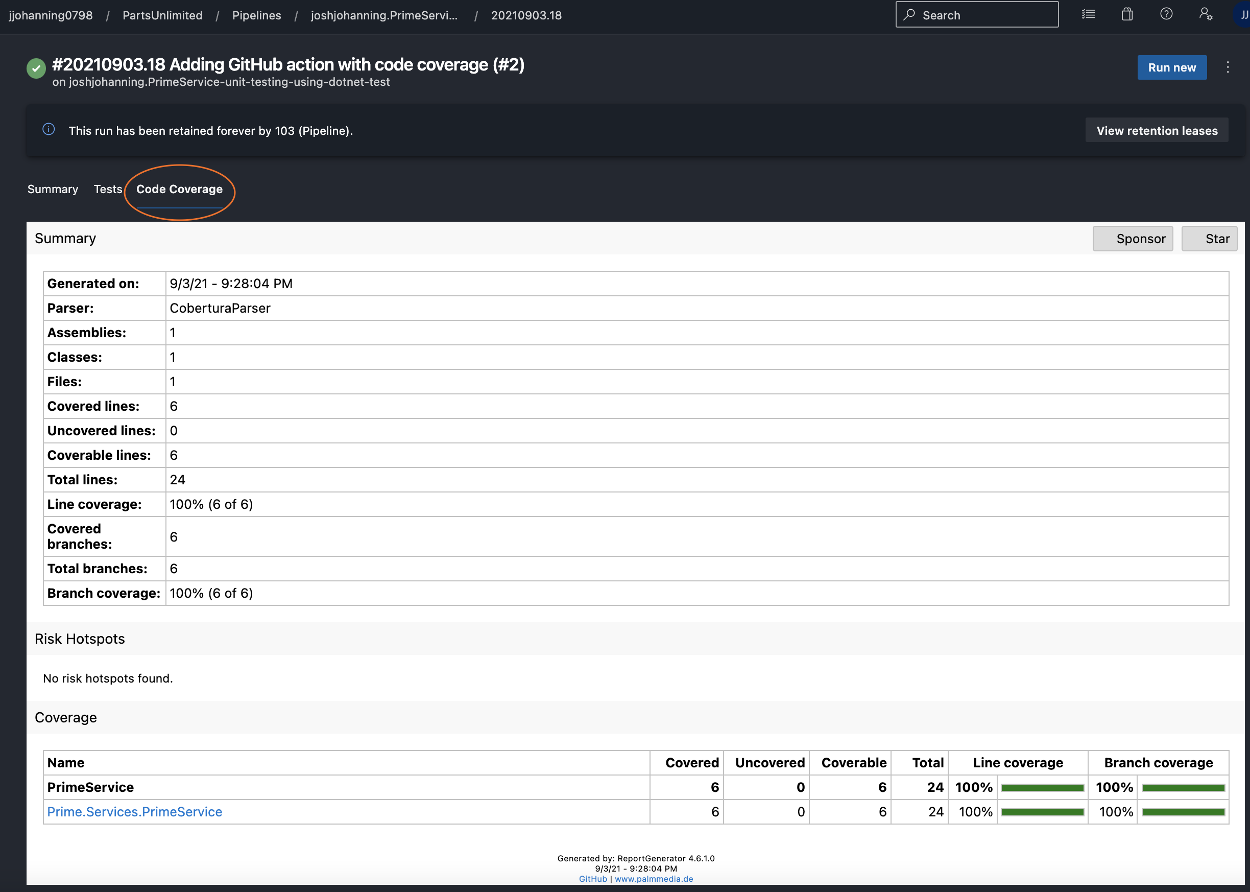 Now, after the entire pipeline has finished (including any of the deployment stages), we will have a code coverage tab with a way more visually appealing code coverage report: