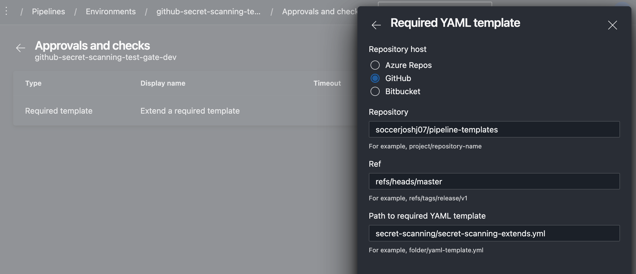 I had a client that wanted to integrate a secret scanning utility (among other checks) into the pipeline, and enforce this control. Colin Dembovsky (my co-worker) and I typically recommend creating and referencing job templates for each environment. Job templates are very flexible, allowing for re-use across an organization but still allowing for differences between applications through the parameters passed into the template.