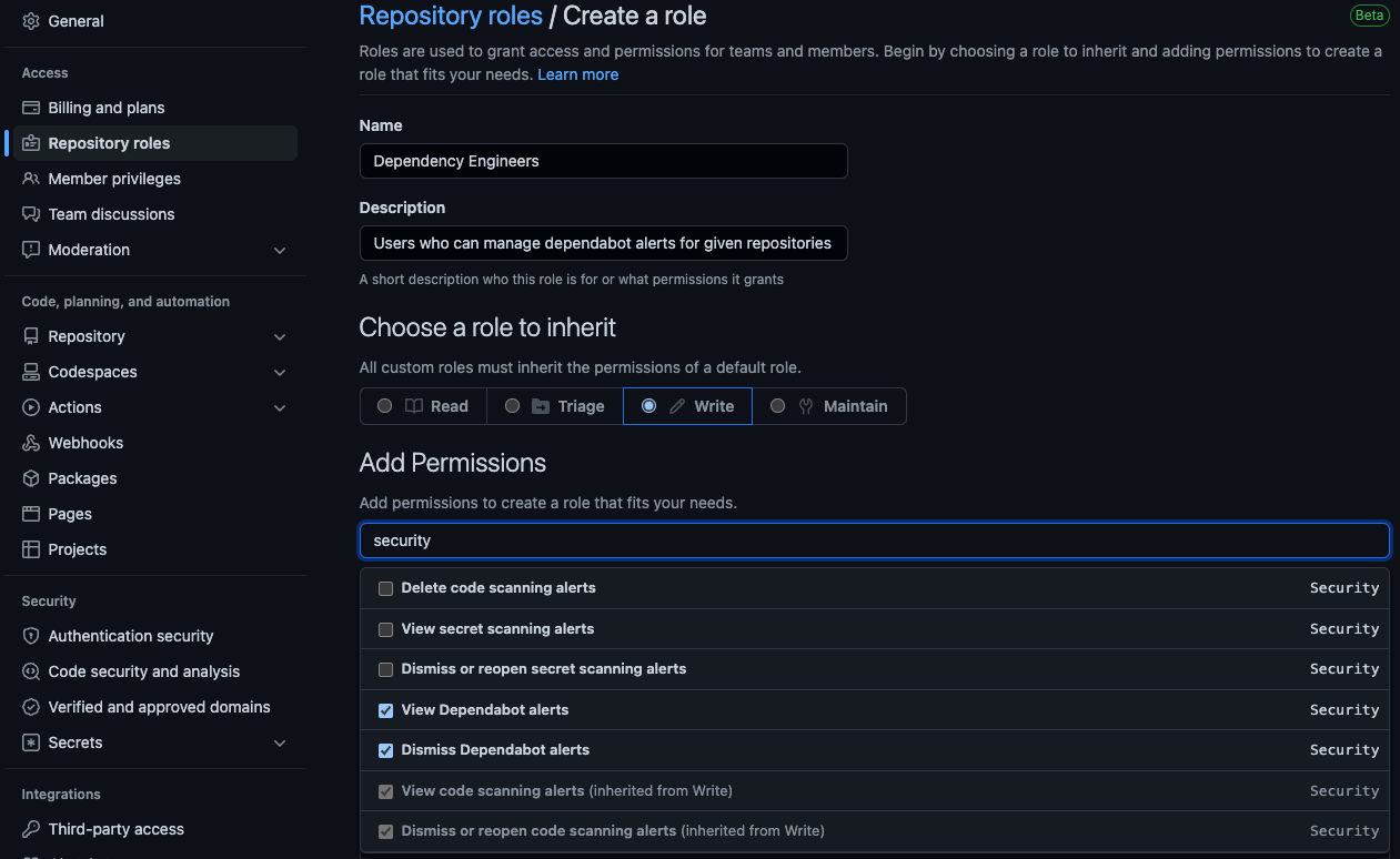 Organization administrators can create Custom Repository Roles to customize and fine-tune different permission sets that repository administrators can grant. For example, I want to create a role that allows users to have Write access AND be able to view/dismiss Dependabot Alerts: