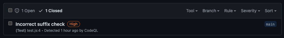 You might notice that some of the queries have the phrase (Test) before the file name. CodeQL tries to determine which files are tests and which are application code automatically: