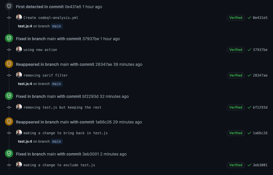 CodeQL result history - when it was opened, closed, and reappeared