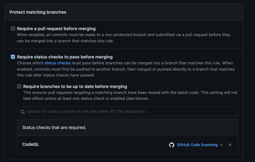CodeQLto add as a status check to the branch protection, it won’t appear as an option until you initiate at least one PR on the repository that triggers and completes the entire CodeQL scan (meaning all of theAnalyzejobs have finished) - as of December 2021, this is still an issue. It is vaguely alluded to in this tidbit in the documentation - emphasis mine:- When the code scanning jobs complete, GitHub works out whether any alerts were added by the pull request and adds the “Code scanning results / TOOL NAME” entry to the list of checks. After code scanning has been performed at least once, you can click Details to view the results of the analysis.