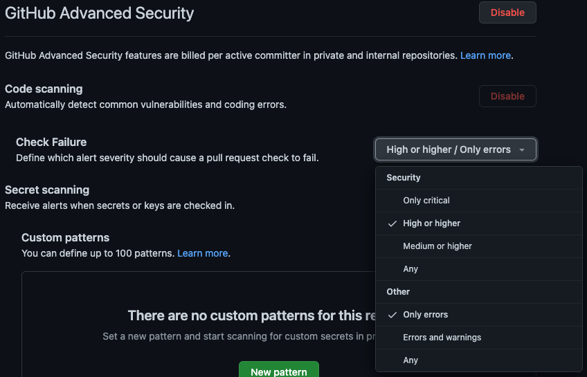 For more information, see the documentation for Defining the severities causing pull request check failure.