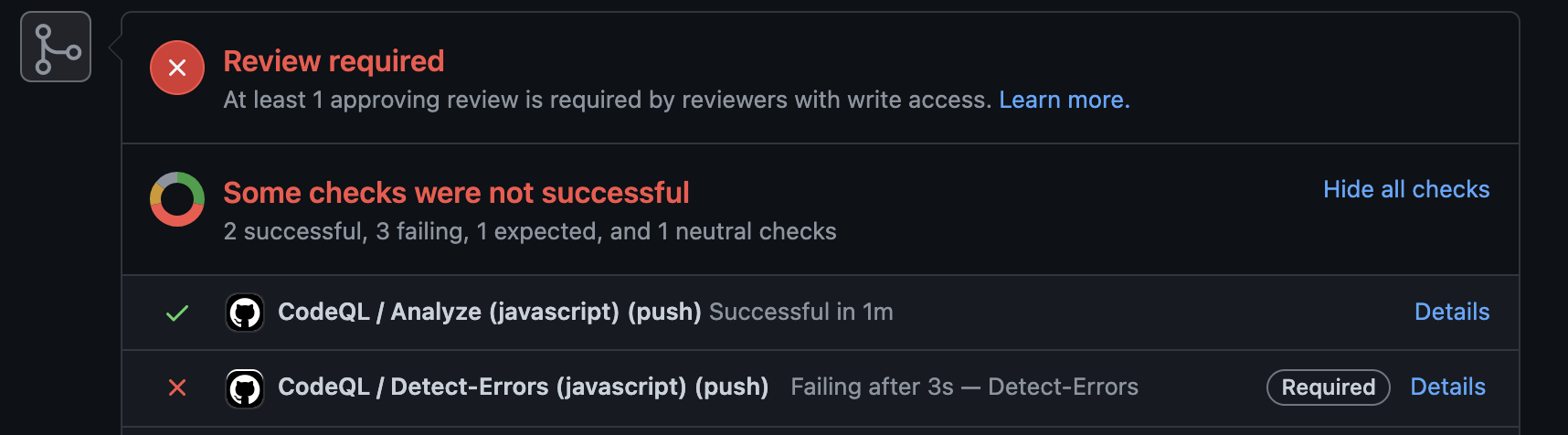 Step #9 was the part I wasn’t originally confused on. The other entry (eg. Analyze (javascript)) is only the scan job for the corresponding language. It should succeed irregardless of if vulnerabilities are found. If it fails, the autobuild task might not be able to compile your code. The Understanding the pull request checks GitHub documentation summarizes well.