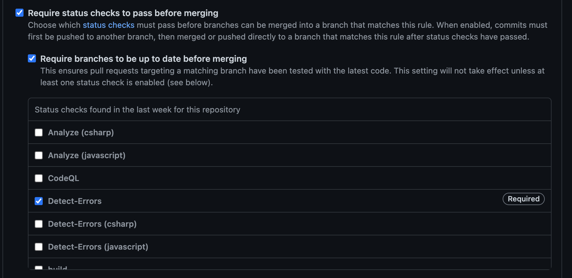 Now just like we did above, we can modify our branch rule to require the “Detect-Errors” job to finish successfully, as this job will run successfully if there are no errors/warnings.