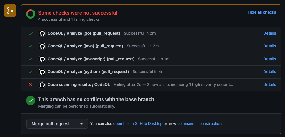 Success! Or, failure, just as we wanted - the pull request cannot be merged because the CodeQL status check failed, meaning it detected a vulnerability in the code.
