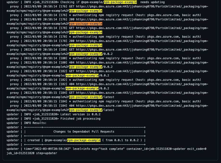Dependabot logs showing that there is a new package version from Azure Artifacts