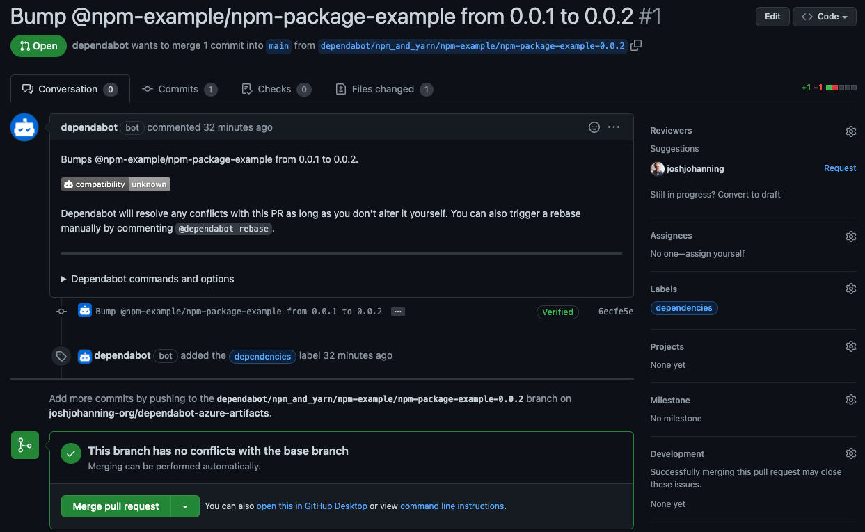 Shortly after committing the .dependabot.yml file, we can confirm it works as there’s a new PR from Dependabot: