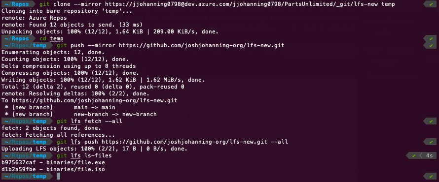 Now that your Git repo, including LFS artifacts, is migrated, you can delete the temp folder, update remotes on your local repo, and continue working as normal! 🚀