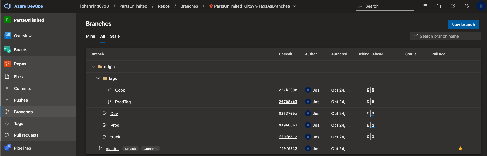 How tags appear in Azure DevOps (as branches)