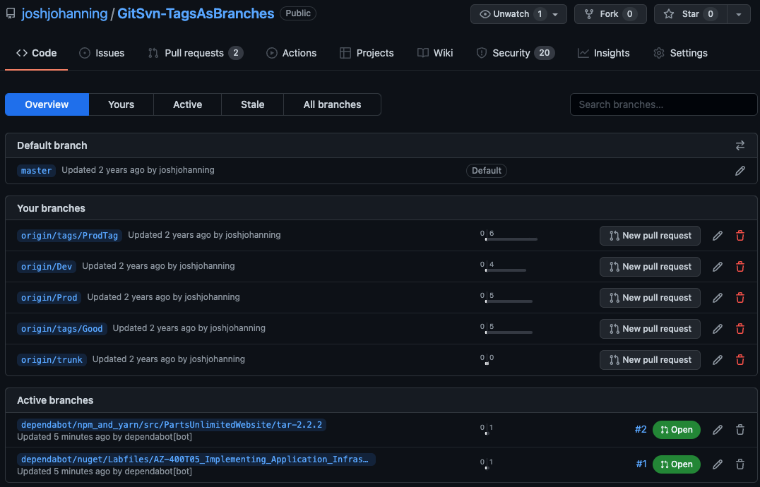 How tags appear in GitHub (as branches) - You can even see that Dependabot created a few branches!