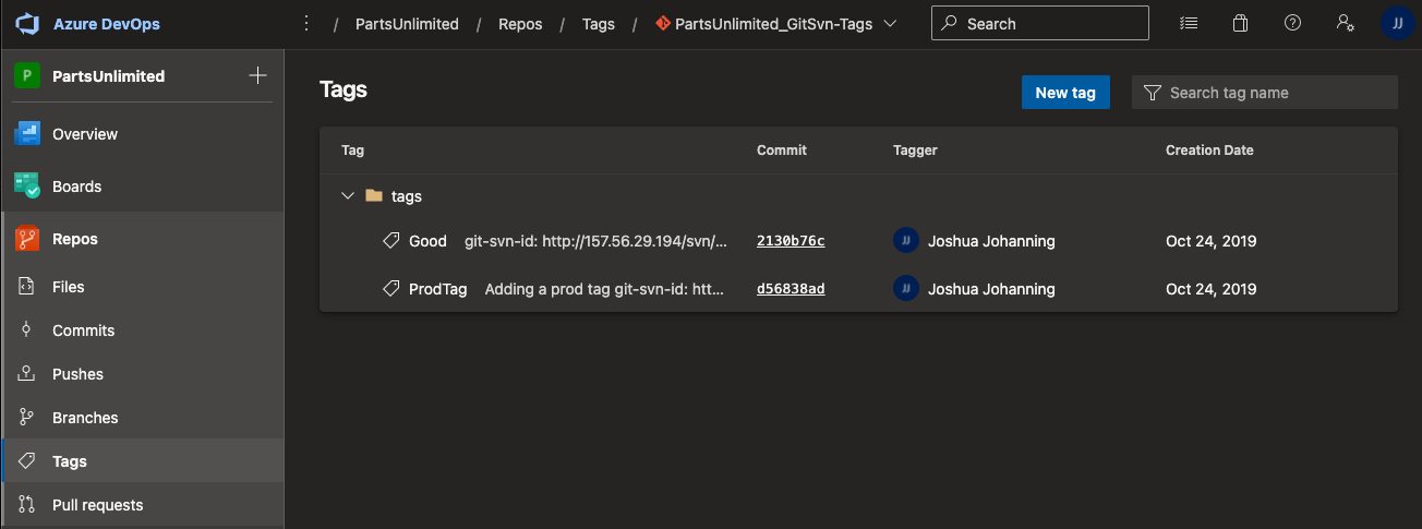 How tags appear in Azure DevOps (as tags)