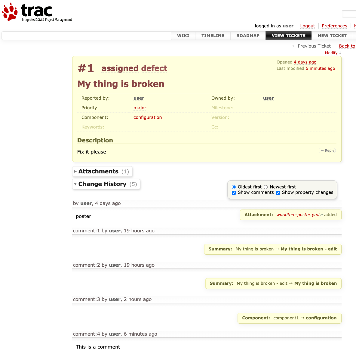sudo bundle exec trac-hub -v -s 1 -F. Command line options:-v: verbose/debug logging-s 1: start at the the first ticket in Trac-F: fast import, import without safety-checking the issue number. The way this tool runs is it expects Trac ticket #1 to be created as Issue #1. If you already have issues in the repository, or you want to do testing, add the -F import. For your real migration, you could probably drop this and trac ticket #1 will map to issue #1. Otherwise, with this-Fargument, the issues will be created even though the ID’s won’t make 1:1.- No example here, but