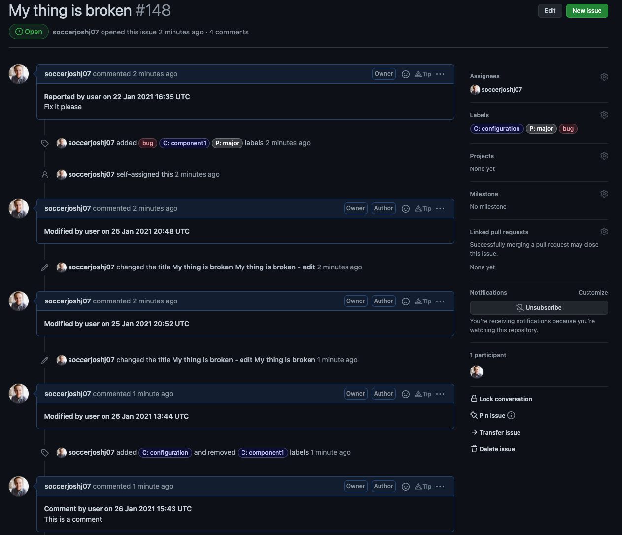 The caveats of both of the tools is that the “Issue creator” will appear as the one who originally ran the tool - but at least with this tool, we can preserve create and comment dates.
