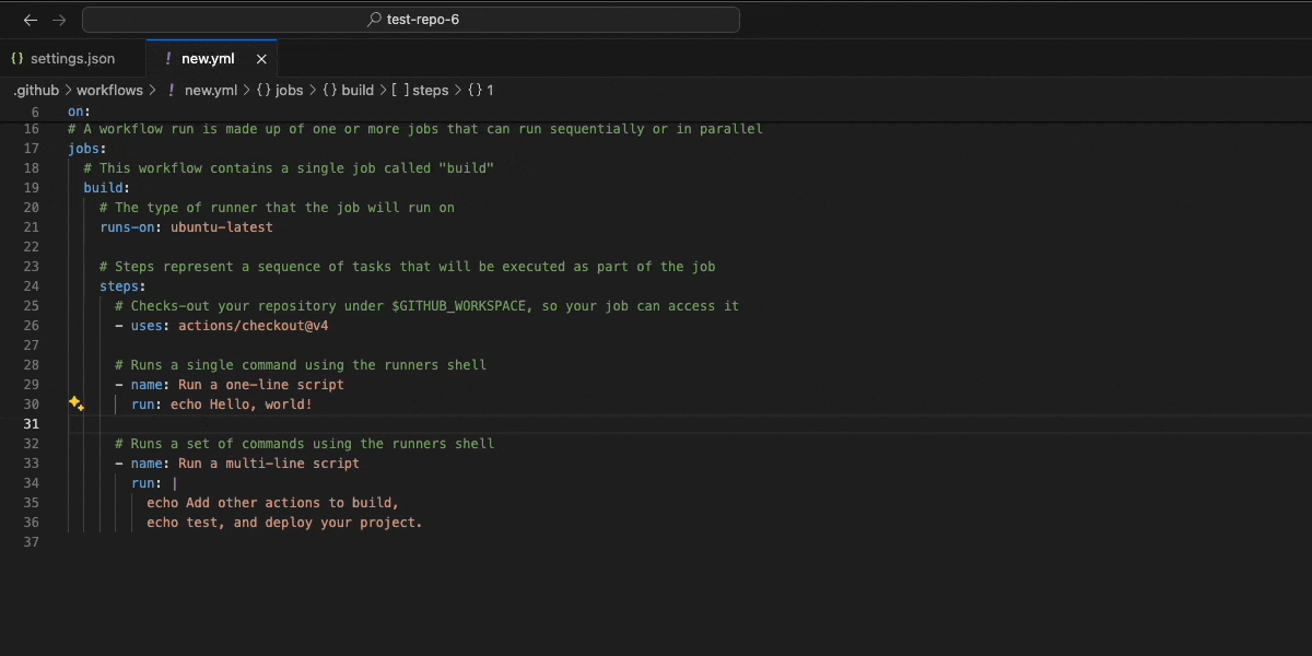 This setting will prevent auto-indentation on paste for YAML files. You’ll notice that there’s 2 blocks: the [yaml] block and the [github-actions-workflow] block. If you have the VS Code extension for GitHub Actions, the [github-actions-workflow] is required. With this, you can set different settings GitHub Action YAML files and other YAML files.
